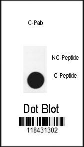 Dot blot analysis of anti-APG3-cleaved Pab (Cat. APG01911G) on nitrocellulose membrane. 50ng of Cleaved-peptide or Non Cleaved-peptide per dot were adsorbed. Antibody working concentrations are 0.6ug per ml. |
