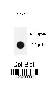 Dot blot analysis of anti-phospho-Sox2-pS246 Phospho-specific Pab (Cat. APR12842G) on nitrocellulose membrane. 50ng of Phospho-peptide or Non Phospho-peptide per dot were adsorbed. Antibody working concentrations are 0.6ug per ml. |