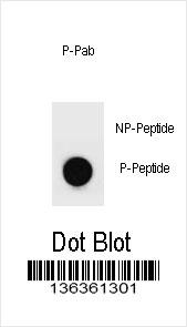 Dot blot analysis of Phospho-MYH9-Y158 Antibody Phospho-specific Pab (Cat. APR14366G) on nitrocellulose membrane. 50ng of Phospho-peptide or Non Phospho-peptide per dot were adsorbed. Antibody working concentrations are 0.6ug per ml. |