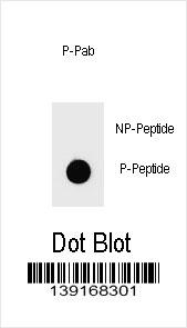 Dot blot analysis of Phospho-PARP1-S864 Antibody Phospho-specific Pab (Cat. APR09180G) on nitrocellulose membrane. 50ng of Phospho-peptide or Non Phospho-peptide per dot were adsorbed. Antibody working concentrations are 0.6ug per ml. |