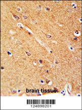 ANKFY1 Antibody (C-term) (Cat. APR14928G) immunohistochemistry analysis in formalin fixed and paraffin embedded human brain tissue followed by peroxidase conjugation of the secondary antibody and DAB staining. This data demonstrates the use of the ANKFY1 Antibody (C-term) for immunohistochemistry. Clinical relevance has not been evaluated.
