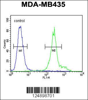 ANKFY1 Antibody (C-term) (Cat. APR14928G) flow cytometric analysis of MDA-MB435 cells (right histogram) compared to a negative control cell (left histogram).FITC-conjugated goat-anti-rabbit secondary antibodies were used for the analysis. |