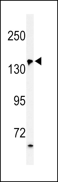 All lanes : Anti-PUR4 Antibody (N-term) at 1:1000 dilution Lane 1: 293T/17 whole cell lysate Lane 2: Jurkat whole cell lysate Lysates/proteins at 20 μg per lane. Secondary Goat Anti-Rabbit IgG, (H+L), Peroxidase conjugated at 1/10000 dilution. Predicted band size : 145 kDa Blocking/Dilution buffer: 5% NFDM/TBST.