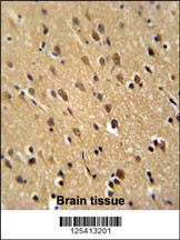 PUR4 Antibody (N-term) (Cat. AMR09663G) immunohistochemistry analysis in formalin fixed and paraffin embedded human brain tissue followed by peroxidase conjugation of the secondary antibody and DAB staining. This data demonstrates the use of the PUR4 Antibody (N-term) for immunohistochemistry. Clinical relevance has not been evaluated. |