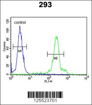 ERMIN Antibody (Center) (Cat. APR11865G) flow cytometric analysis of 293 cells (right histogram) compared to a negative control cell (left histogram).FITC-conjugated goat-anti-rabbit secondary antibodies were used for the analysis. |