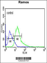 ARHGAP30 Antibody (C-term) (Cat. APR15014G) flow cytometric analysis of Ramos cells (right histogram) compared to a negative control cell (left histogram).FITC-conjugated goat-anti-rabbit secondary antibodies were used for the analysis. |