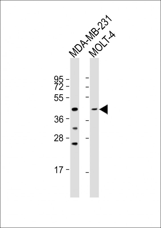 All lanes : Anti-CCR7 Antibody (N-term) at 1:500-1:1000 dilution Lane 1: MDA-MB-231 whole cell lysate Lane 2: MOLT-4 whole cell lysate Lysates/proteins at 20 μg per lane. Secondary Goat Anti-Rabbit IgG, (H+L), Peroxidase conjugated at 1/10000 dilution. Predicted band size : 43 kDa Blocking/Dilution buffer: 5% NFDM/TBST.