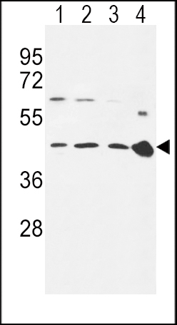 CCR7 Antibody (N-term) (Cat. APR15287G) western blot analysis in 293(lane 1),Ramos(lane 2),MDA-MB231(lane 3) cell line and mouse spleen tissue(lane 4) lysates (35ug/lane).This demonstrates the CCR7 antibody detected the CCR7 protein (arrow). |