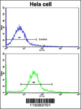 Flow cytometric analysis of hela cells using CA9 Antibody (Center)(bottom histogram) compared to a negative control cell (top histogram). FITC-conjugated goat-anti-rabbit secondary antibodies were used for the analysis.