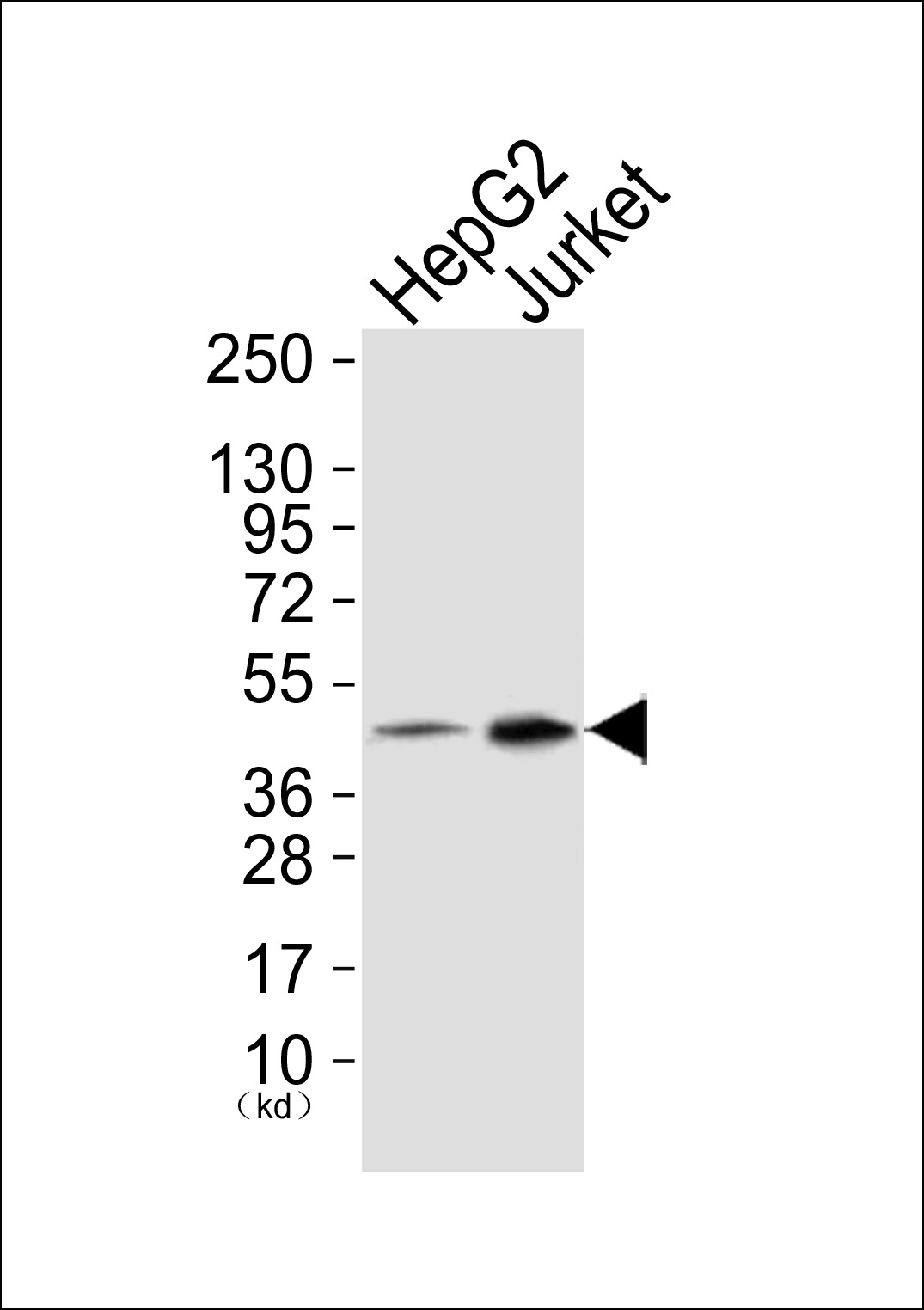 Western blot analysis of extracts from HepG2 cells (Lane 1) and Jurket cells (Lane 2), using Neutrophil Cytosol Factor 1 (Ab-304) Antibody. The lane on the left is treated with synthesized peptide.
