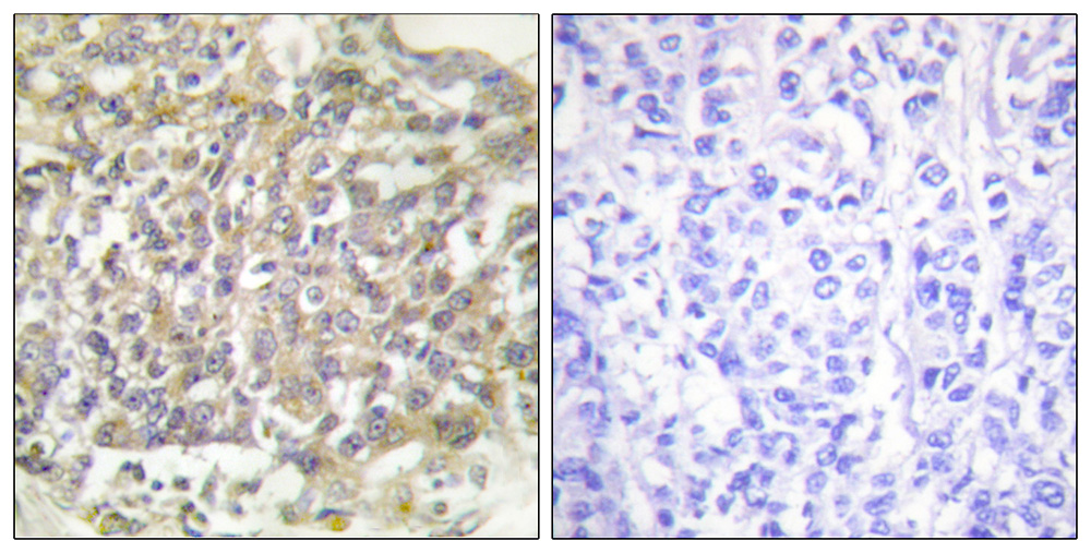 Immunohistochemical analysis of paraffin-embedded human breast carcinoma tissue using Shc (Ab-349) antibody. |