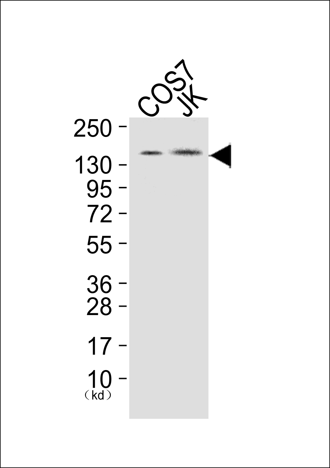 Western blot analysis of extracts from COS7 cells (Lane 1), and JK cells (Lane 2), using PLCG1 (Ab-771) Antibody. The lane on the left is treated with synthesized peptide.