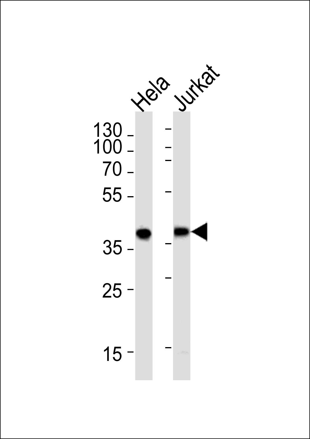 Western blot analysis of lysates from Hela,Jurkat cell line (from left to right),using PAR4 Antibody(G939). G939 was diluted at 1:1000 at each lane. A goat anti-rabbit IgG H&L(HRP) at 1:5000 dilution was used as the secondary antibody.Lysates at 35ug per lane.