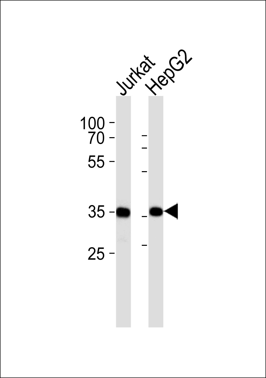 Western blot analysis of lysates from Jurkat,HepG2 cell line (from left to right),using PDLIM1 Antibody(C10012). C10012 was diluted at 1:1000 at each lane. A goat anti-rabbit IgG H&L(HRP) at 1:5000 dilution was used as the secondary antibody.Lysates at 35ug per lane.