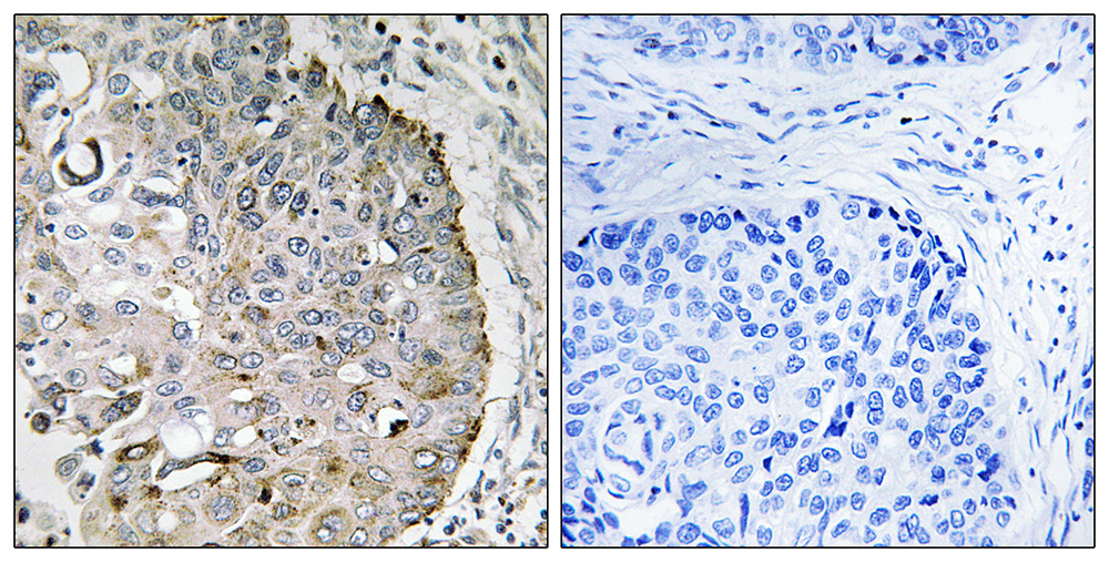 Immunohistochemistry analysis of paraffin-embedded human lung carcinoma tissue, using MRRF antibody. |
