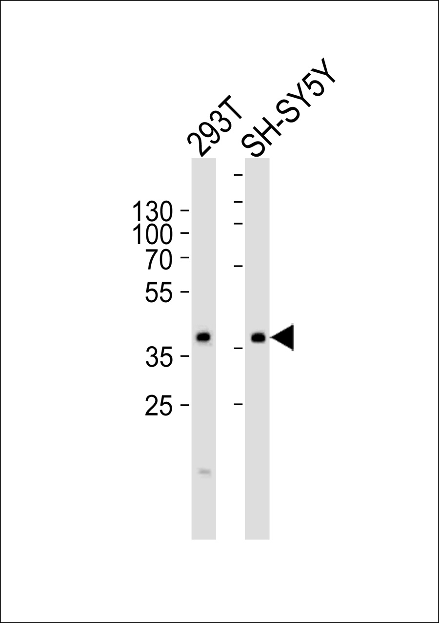 Western blot analysis of lysates from 293T,SH-SY5Y cell line (from left to right),using CALB2 Antibody(APR11536G). APR11536G was diluted at 1:1000 at each lane. A goat anti-rabbit IgG H&L(HRP) at 1:5000 dilution was used as the secondary antibody.Lysates at 35ug per lane. |
