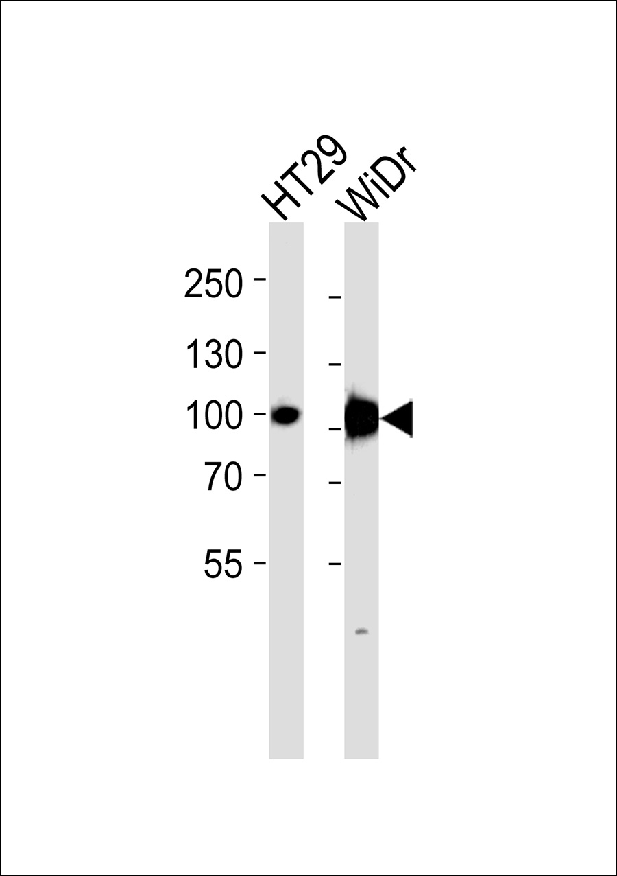 Western blot analysis of lysates from HT29,WiDr cell line (from left to right),using SLC15A1 Antibody(APR09980G). APR09980G was diluted at 1:1000 at each lane. A goat anti-rabbit IgG H&L(HRP) at 1:5000 dilution was used as the secondary antibody.Lysates at 35ug per lane. |