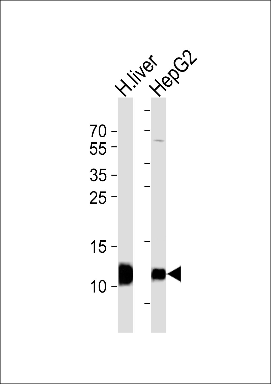 Western blot analysis of lysates from HepG2 cell line and human liver tissue lysate(from left to right),using FABP1 Antibody was diluted at 1:1000 at each lane. A goat anti-rabbit IgG H&L(HRP) at 1:5000 dilution was used as the secondary antibody.Lysates at 35ug per lane. |