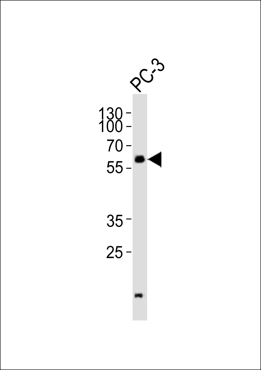 Western blot analysis of lysate from PC-3 cell line,using GK3 Antibody(APR16154G). APR16154G was diluted at 1:1000. A goat anti-rabbit IgG H&L(HRP) at 1:5000 dilution was used as the secondary antibody.Lysate at 35ug. |