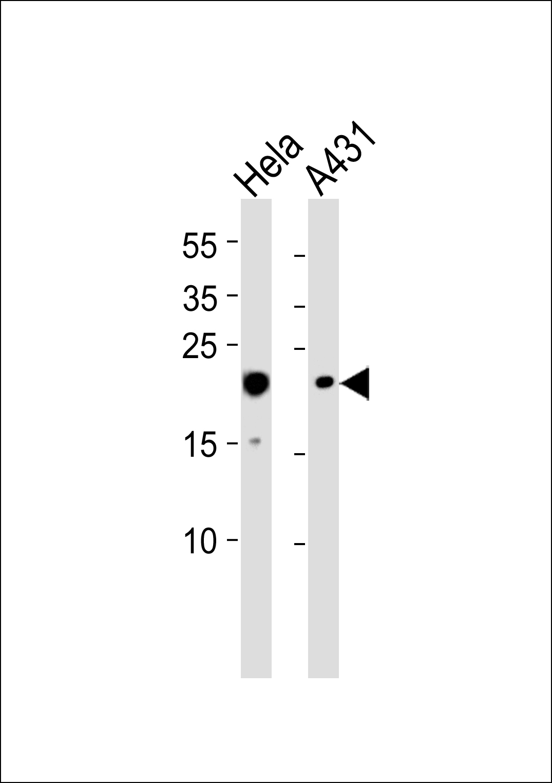 Western blot analysis of lysates from Hela,A431 cell line (from left to right),using TOMM20 Antibody(APR10507G). APR10507G was diluted at 1:1000 at each lane. A goat anti-rabbit IgG H&L(HRP) at 1:5000 dilution was used as the secondary antibody.Lysates at 35ug per lane. |