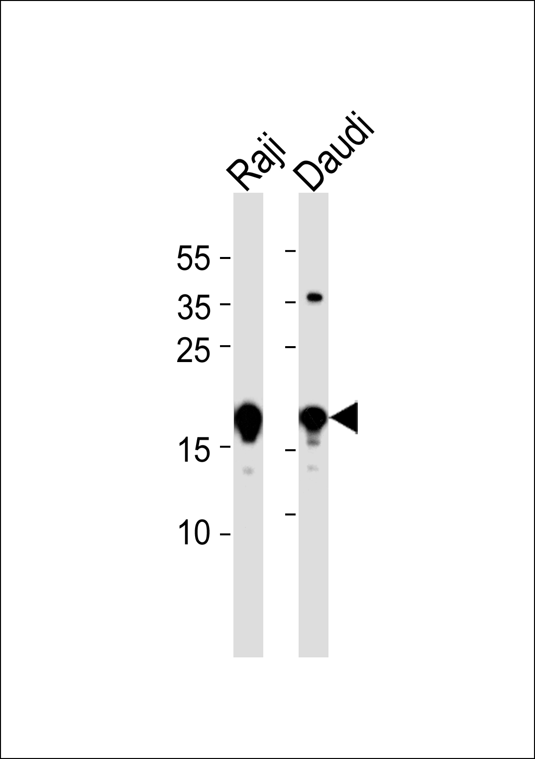 Western blot analysis of lysates from Raji,Daudi cell line (from left to right),using CBLN3 Antibody(APR11567G). APR11567G was diluted at 1:1000 at each lane. A goat anti-rabbit IgG H&L(HRP) at 1:5000 dilution was used as the secondary antibody.Lysates at 35ug per lane.