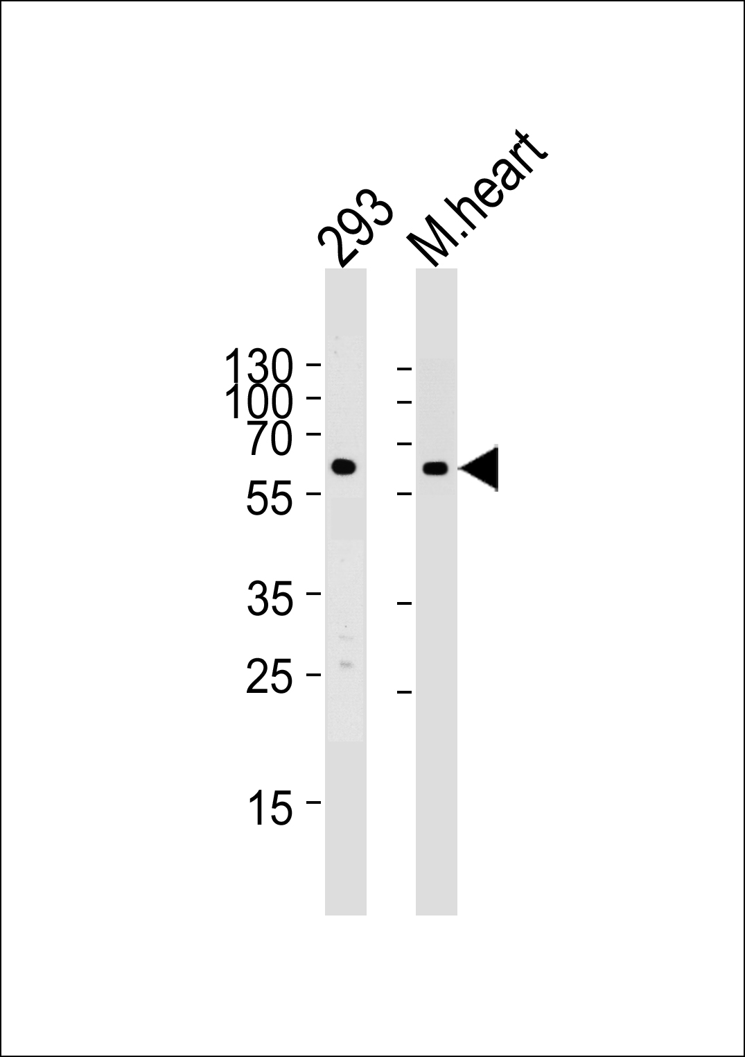 Western blot analysis of lysates from 293 cell line and mouse heart tissue lysate, using HAS2 antibody, was diluted at 1:1000 at each lane. A goat anti-rabbit IgG H&L(HRP) at 1:5000 dilution was used as the secondary antibody. Lysates at 35ug per lane. |