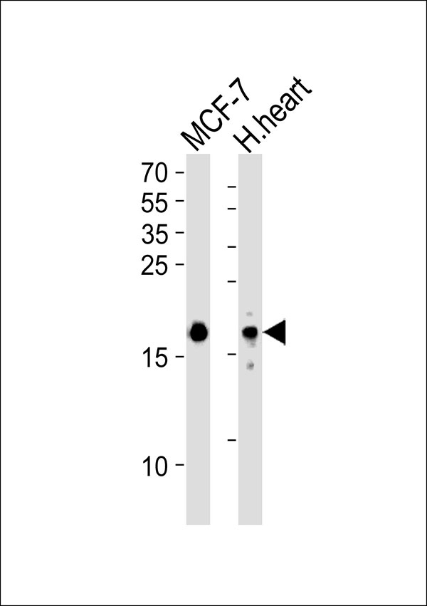 Western blot analysis of lysates from MCF-7 cell line and huamn heart tissue lysate(from left to right),using PPP1R14C Antibody,was diluted at 1:1000 at each lane. A goat anti-rabbit IgG H&L(HRP) at 1:5000 dilution was used as the secondary antibody.Lysates at 35ug per lane. |