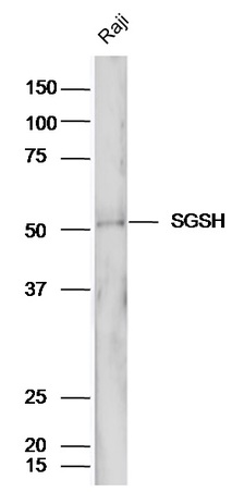 Raji cell lysates probed with Anti-SGSH/Sulphamidase Polyclonal Antibody, Unconjugated (bs-11756R) at 1:300 in 4?C. Followed by conjugation to secondary antibody (bs-0295G-HRP) at 1:3000 90min in 37?C. |