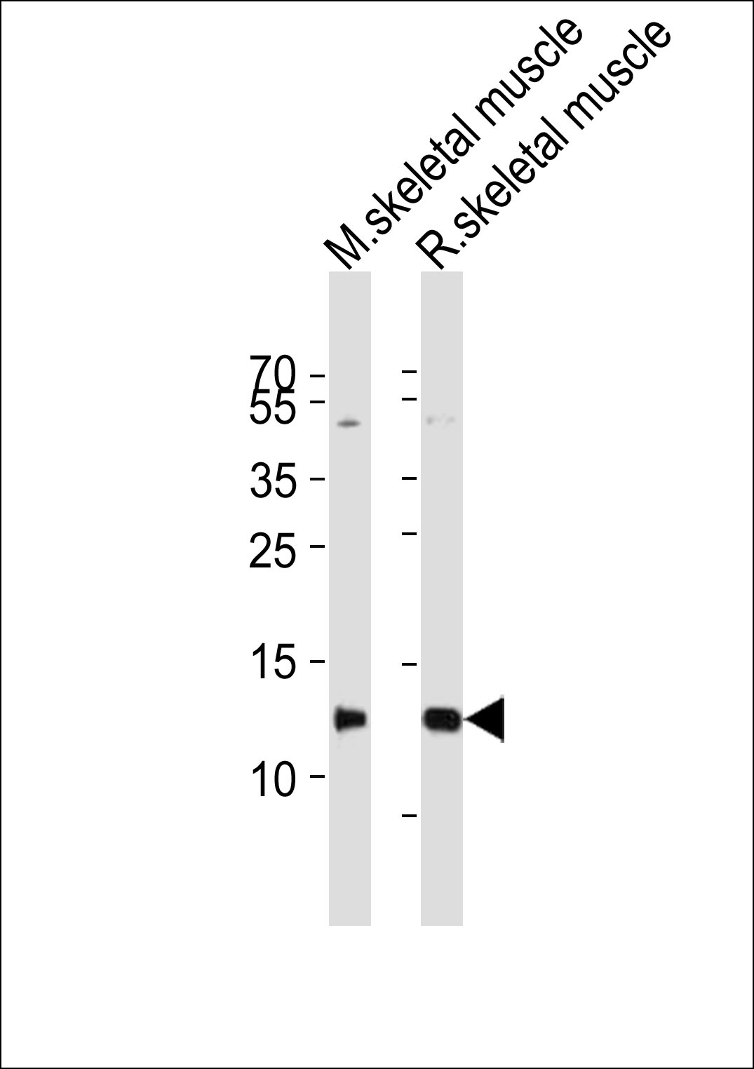 Western blot analysis of lysates from mouse skeletal muscle,rat skeletal muscle tissue lysate (from left to right), using PVALB Antibody(A1-1909). A1-1909 was diluted at 1:1000 at each lane. A goat anti-rabbit IgG H&L(HRP) at 1:10000 dilution was used as the secondary antibody.Lysates at 20ug per lane. |