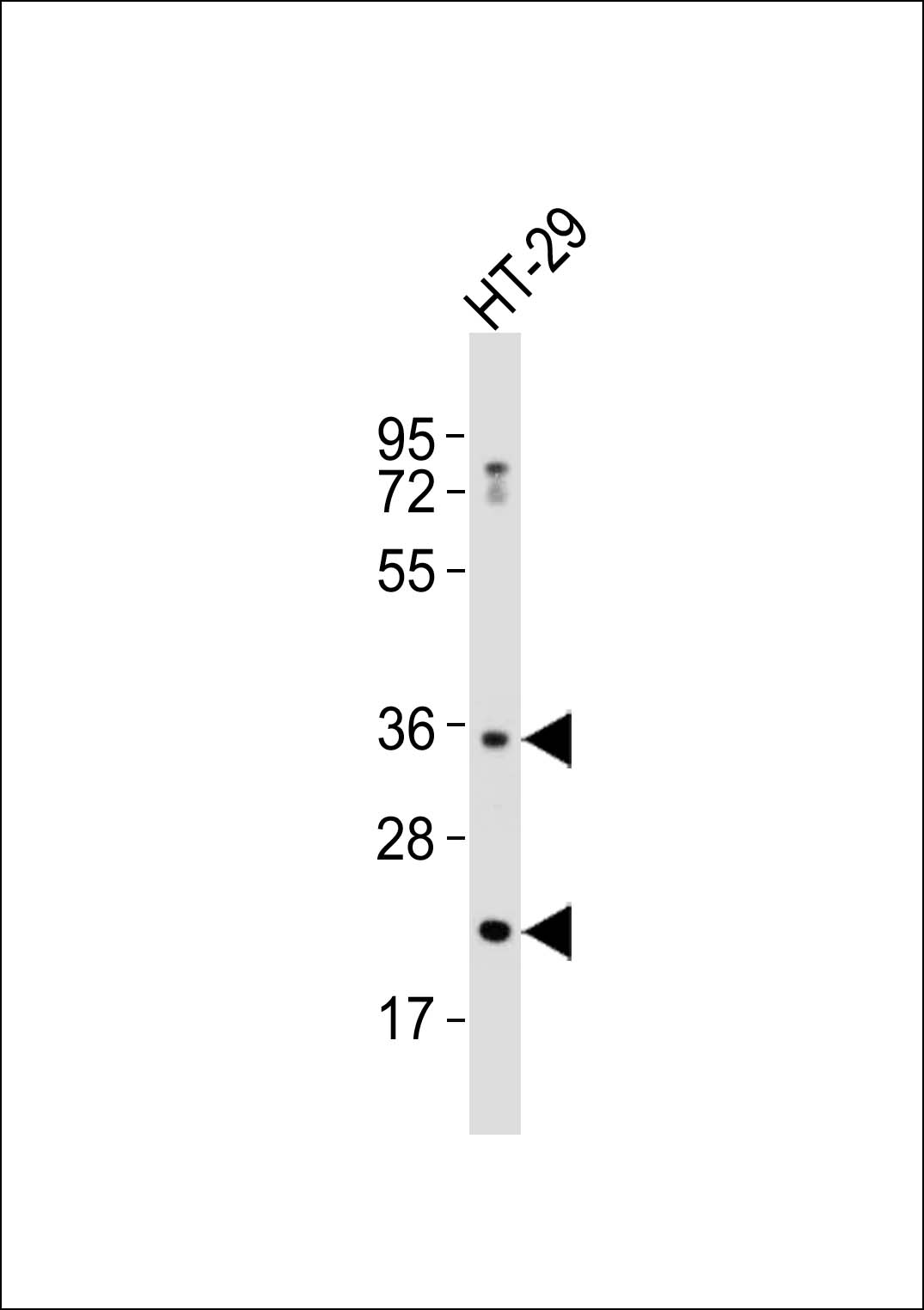 Anti-ABCC13 Antibody at 1:1000 dilution + HT-29 whole cell lysates Lysates/proteins at 20 μg per lane. Secondary Goat Anti-Rabbit IgG, (H+L),Peroxidase conjugated at 1/10000 dilution Predicted band size : 31 kDa Blocking/Dilution buffer: 5% NFDM/TBST. |