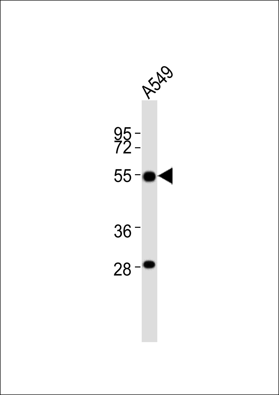 Anti-ALDH3A1 Antibodyat 1:1000 dilution + A549 whole cell lysates Lysates/proteins at 20 μg per lane. Secondary Goat Anti-Rabbit IgG, (H+L),Peroxidase conjugated at 1/10000 dilution Predicted band size : 50 kDa Blocking/Dilution buffer: 5% NFDM/TBST. |
