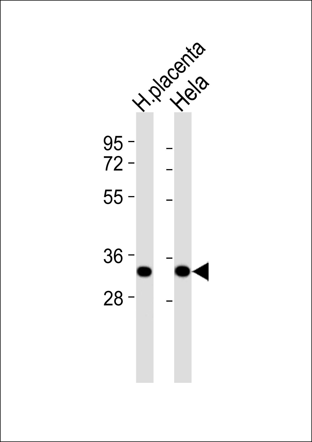 All lanes : Anti-Annexin A3 Antibody at 1:1000 dilution Lane 1: human placenta lysates Lane 2: Hela whole cell lysates Lysates/proteins at 20 μg per lane. Secondary Goat Anti-Rabbit IgG, (H+L),Peroxidase conjugated at 1/10000 dilution Predicted band size : 36 kDa Blocking/Dilution buffer: 5% NFDM/TBST. |
