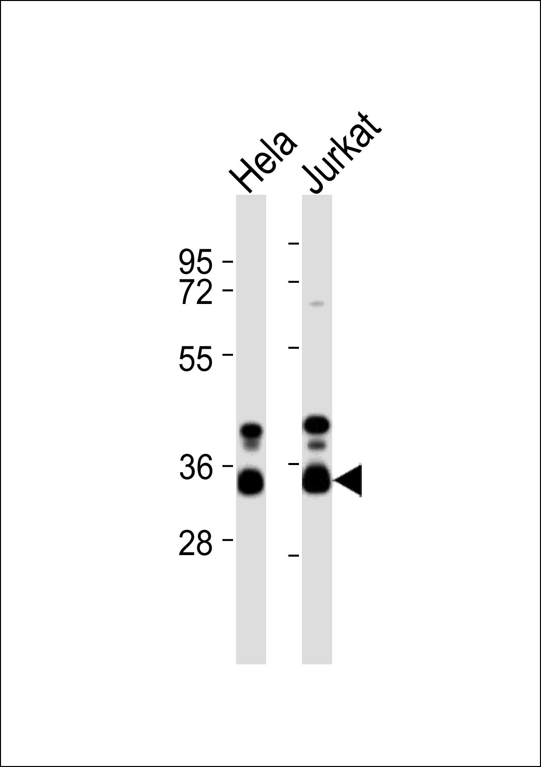 All lanes : Anti-hnRNP A1 Antibody at 1:1000 dilution Lane 1: HeLa whole cell lysates Lane 2:Jurkat whole cell lysates Lysates/proteins at 20 μg per lane. Secondary Goat Anti-Rabbit IgG, (H+L),Peroxidase conjugated at 1/10000 dilution Predicted band size : 39 kDa Blocking/Dilution buffer: 5% NFDM/TBST. |