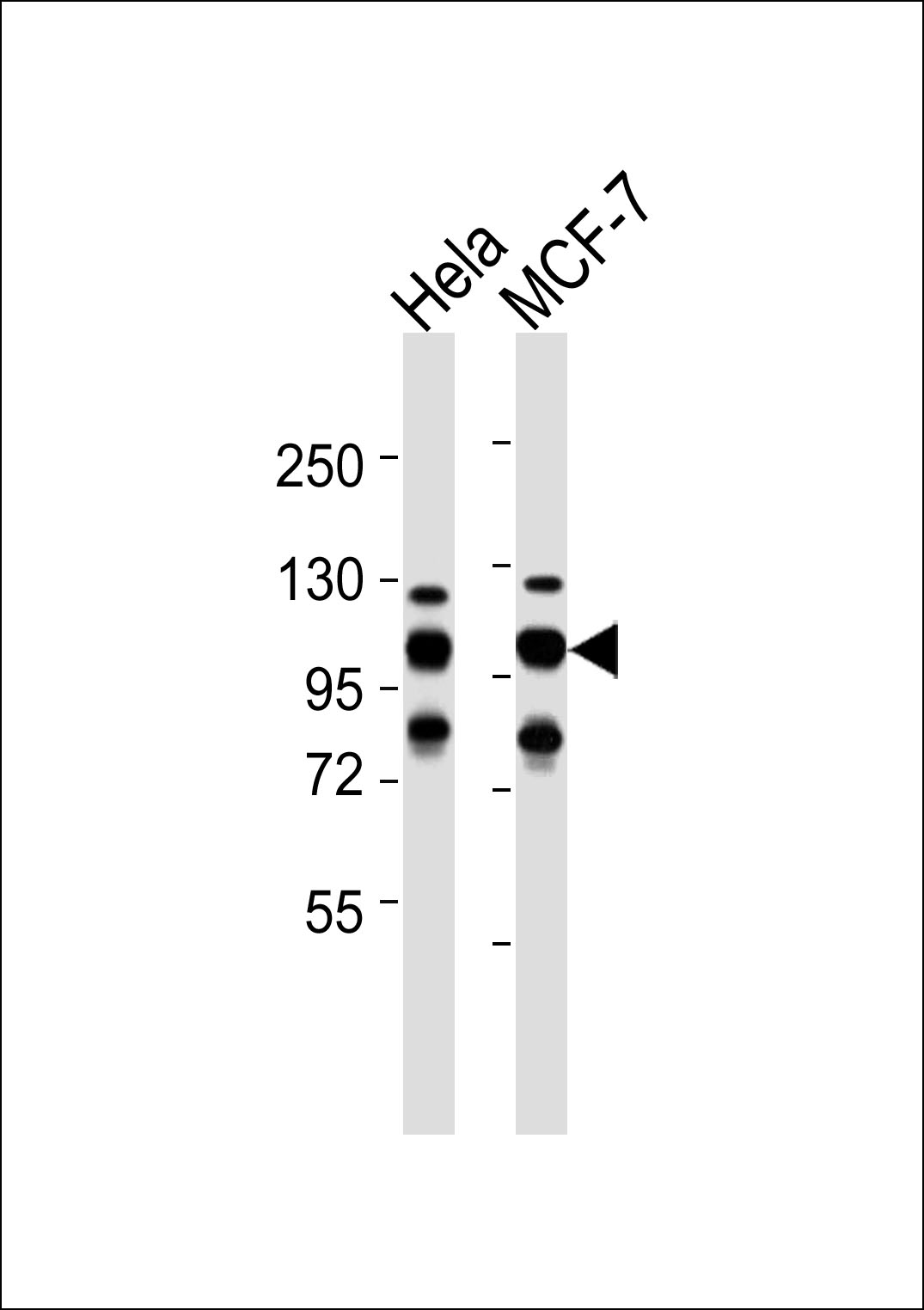 All lanes : Anti-GRP94 Antibody at 1:1000 dilution Lane 1: HeLa whole cell lysates Lane 2: MCF-7 whole cell lysates Lysates/proteins at 20 μg per lane. Secondary Goat Anti-Rabbit IgG, (H+L),Peroxidase conjugated at 1/10000 dilution Predicted band size : 92 kDa Blocking/Dilution buffer: 5% NFDM/TBST. |