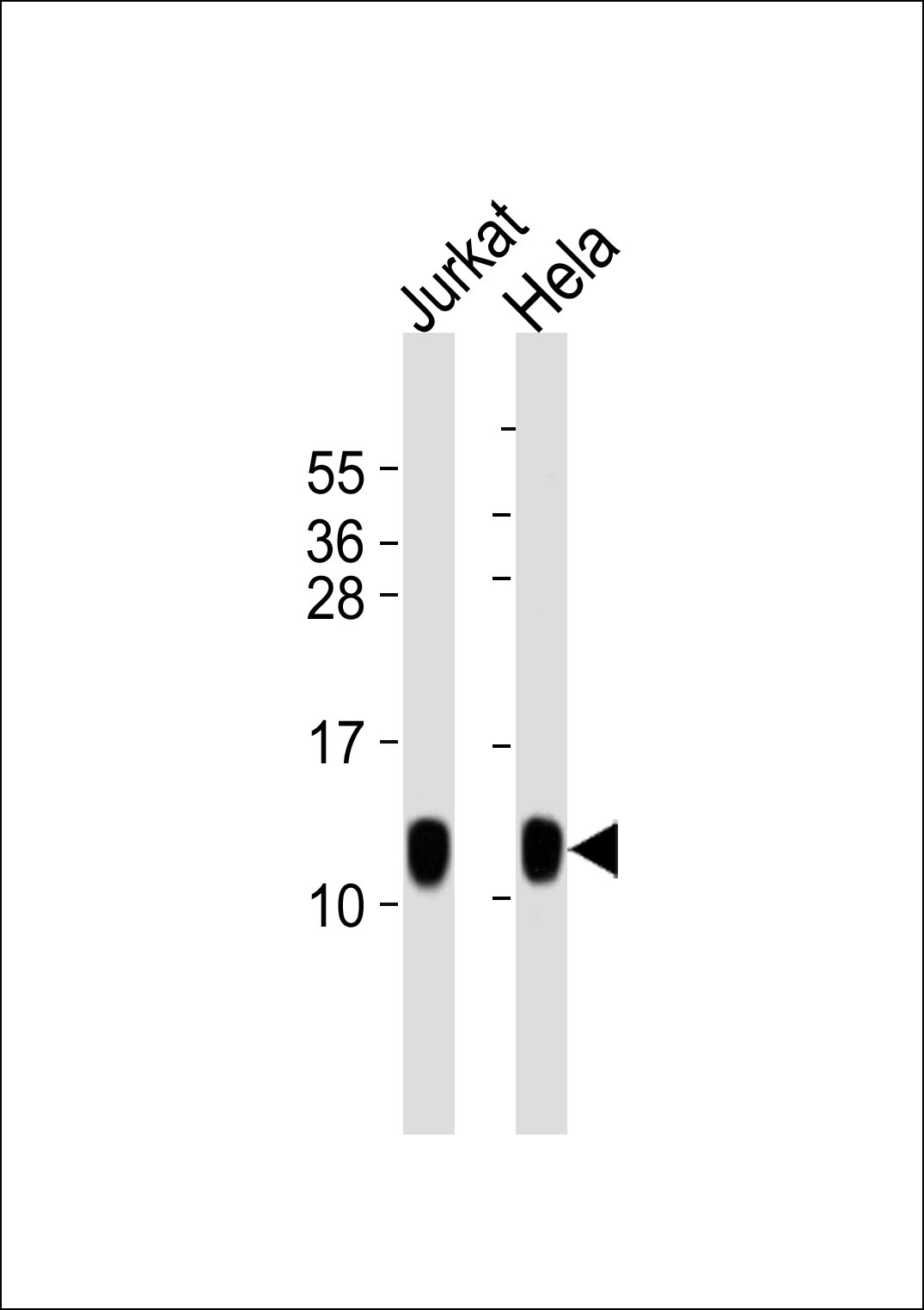 All lanes : Anti-HSPE1 Antibody at 1:1000 dilution Lane 1: Jurkat whole cell lysates Lane 2: Hela whole cell lysates Lysates/proteins at 20 μg per lane. Secondary Goat Anti-Rabbit IgG, (H+L),Peroxidase conjugated at 1/10000 dilution Predicted band size : 11 kDa Blocking/Dilution buffer: 5% NFDM/TBST. |