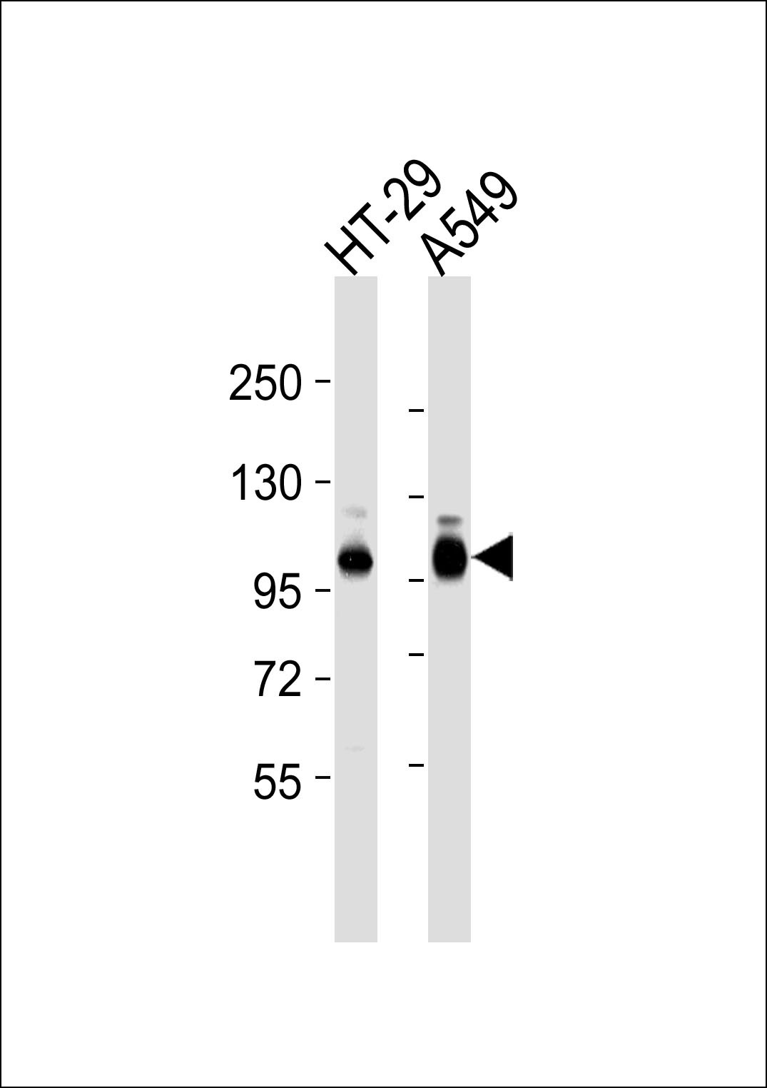 All lanes : Anti-Integrin beta 5 Antibody at 1:1000 dilution Lane 1: HT-29 whole cell lysates Lane 2: A549 whole cell lysates Lysates/proteins at 20 μg per lane. Secondary Goat Anti-Rabbit IgG, (H+L),Peroxidase conjugated at 1/10000 dilution Predicted band size : 88 kDa Blocking/Dilution buffer: 5% NFDM/TBST. |