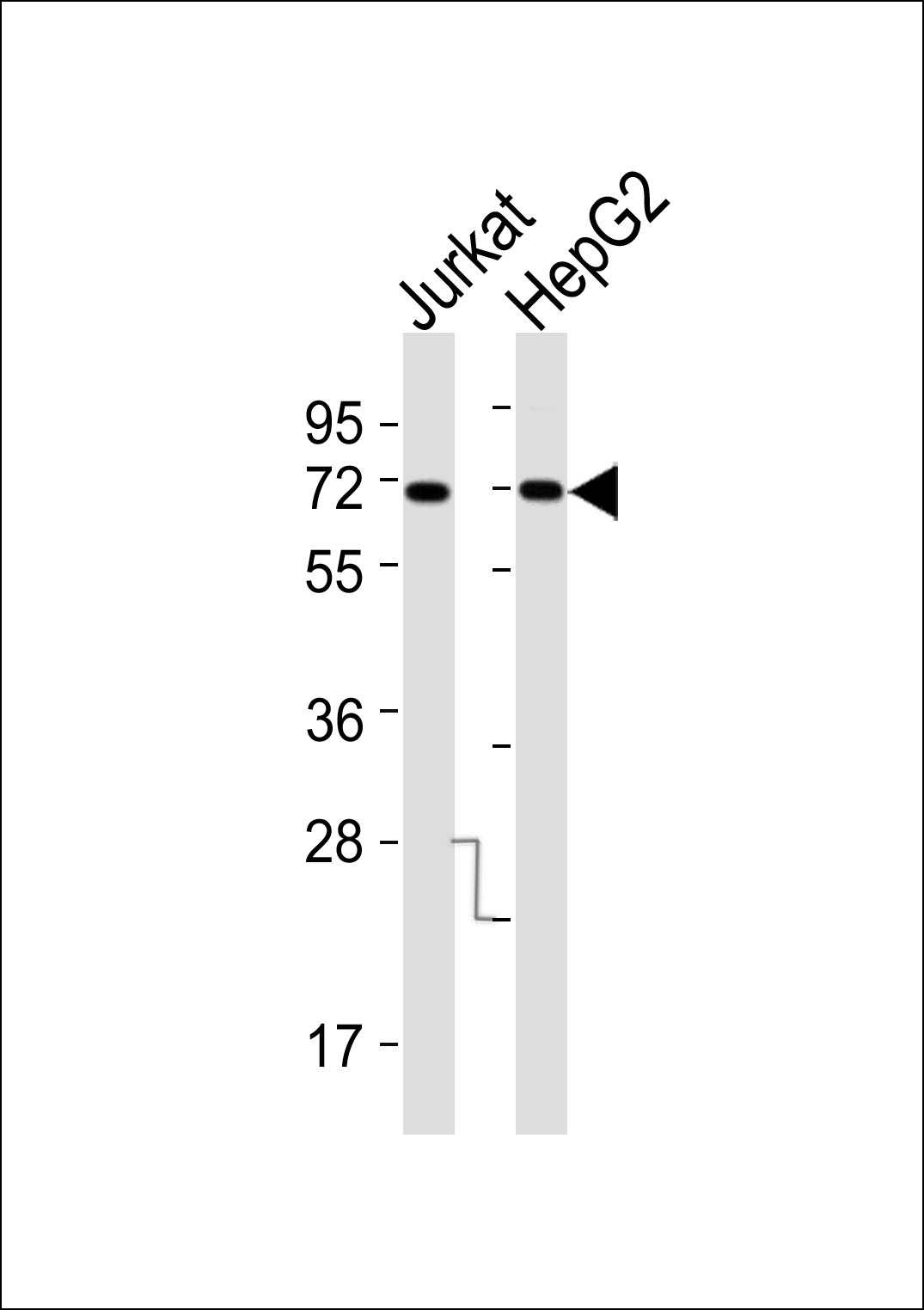 All lanes : Anti-Kv3.1 Antibody at 1:1000 dilution Lane 1: Jurkat whole cell lysates Lane 2: HepG2 whole cell lysates Lysates/proteins at 20 μg per lane. Secondary Goat Anti-Rabbit IgG, (H+L),Peroxidase conjugated at 1/10000 dilution Predicted band size : 58 kDa Blocking/Dilution buffer: 5% NFDM/TBST. |