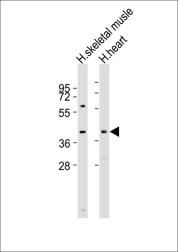 All lanes : Anti-Alpha-sarcoglycan Antibody at 1:1000 dilution Lane 1: human skeletal musle lysates Lane 2: human heart lysates Lysates/proteins at 20 μg per lane. Secondary Goat Anti-Rabbit IgG, (H+L),Peroxidase conjugated at 1/10000 dilution Predicted band size : 43 kDa Blocking/Dilution buffer: 5% NFDM/TBST. |