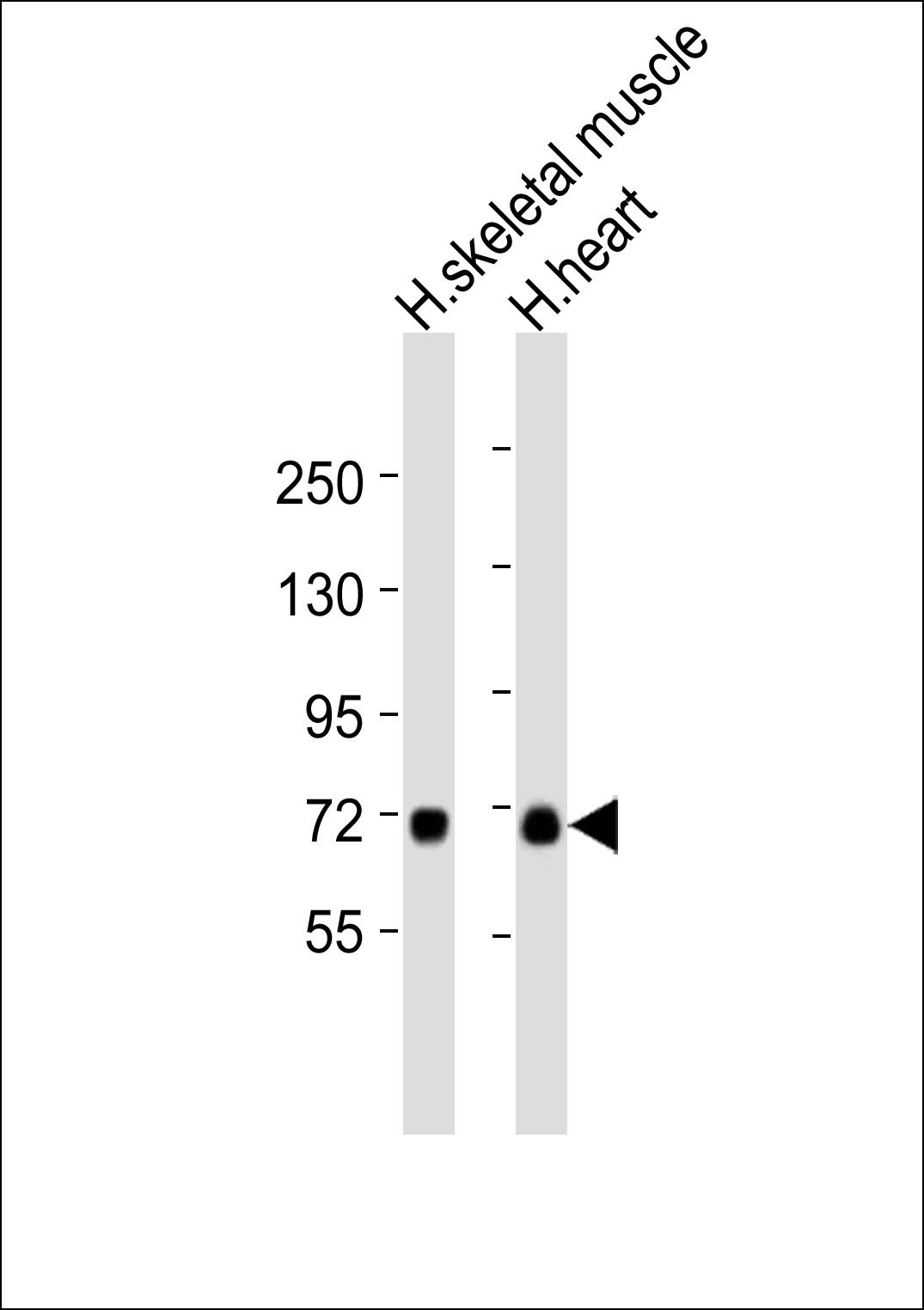 All lanes : Anti-ARALAR1 Antibody at 1:1000 dilution Lane 1: human skeletal muscle lysates Lane 2: human heart lysates Lysates/proteins at 20 μg per lane. Secondary Goat Anti-Rabbit IgG, (H+L),Peroxidase conjugated at 1/10000 dilution Predicted band size : 75 kDa Blocking/Dilution buffer: 5% NFDM/TBST. |
