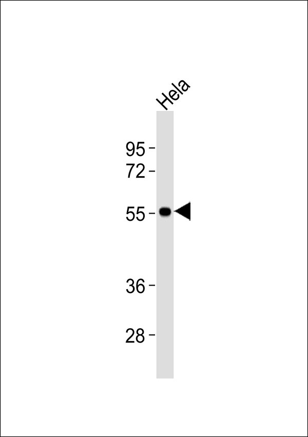 Anti-ENT1 Antibodyat 1:1000 dilution + Hela whole cell lysates Lysates/proteins at 20 μg per lane. Secondary Goat Anti-Rabbit IgG, (H+L),Peroxidase conjugated at 1/10000 dilution Predicted band size : 50 kDa Blocking/Dilution buffer: 5% NFDM/TBST. |