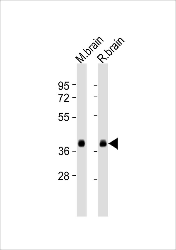 All lanes : Anti-Synaptophysin Antibody at 1:1000 dilution Lane 1: mouse brain lysates Lane 2: rat brain lysates Lysates/proteins at 20 μg per lane. Secondary Goat Anti-Rabbit IgG, (H+L),Peroxidase conjugated at 1/10000 dilution Predicted band size : 34 kDa Blocking/Dilution buffer: 5% NFDM/TBST. |