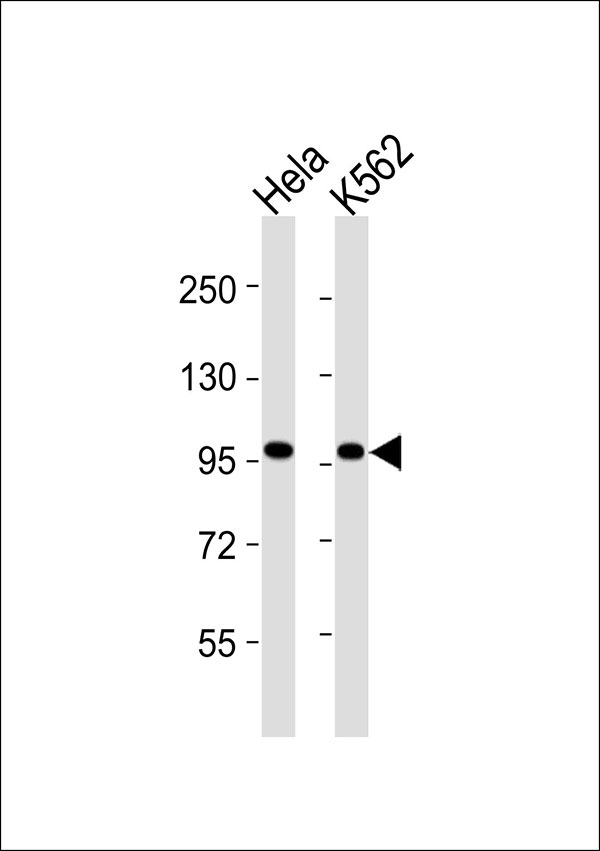 All lanes : Anti-VCP Antibody at 1:1000 dilution Lane 1: Hela whole cell lysates Lane 2: K562 whole cell lysates Lysates/proteins at 20 μg per lane. Secondary Goat Anti-Rabbit IgG, (H+L),Peroxidase conjugated at 1/10000 dilution Predicted band size : 89 kDa Blocking/Dilution buffer: 5% NFDM/TBST. |