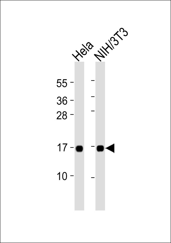 All lanes : Anti-IFITM3 Antibody at 1:1000 dilution Lane 1: Hela whole cell lysates Lane 2: NIH/3T3 whole cell lysates Lysates/proteins at 20 μg per lane. Secondary Goat Anti-Rabbit IgG, (H+L),Peroxidase conjugated at 1/10000 dilution Predicted band size : 15 kDa Blocking/Dilution buffer: 5% NFDM/TBST. |