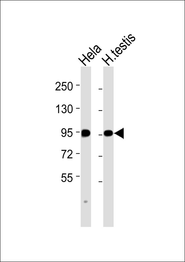 All lanes : Anti-Mitofilin Antibody at 1:1000 dilution Lane 1: Hela whole cell lysates Lane 2: human testis lysates Lysates/proteins at 20 μg per lane. Secondary Goat Anti-Rabbit IgG, (H+L),Peroxidase conjugated at 1/10000 dilution Predicted band size : 84 kDa Blocking/Dilution buffer: 5% NFDM/TBST. |