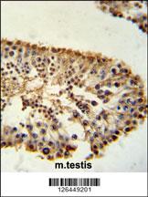 ERO1LB Antibody (C-term) (Cat. APR15876G) immunohistochemistry analysis in formalin fixed and paraffin embedded mouse testis tissue followed by peroxidase conjugation of the secondary antibody and DAB staining. This data demonstrates the use of the ERO1LB Antibody (C-term) for immunohistochemistry. Clinical relevance has not been evaluated.