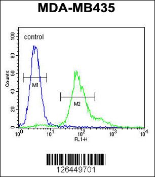ERO1LB Antibody (C-term) (Cat. APR15876G) flow cytometric analysis of MDA-MB435 cells (right histogram) compared to a negative control cell (left histogram).FITC-conjugated goat-anti-rabbit secondary antibodies were used for the analysis. |