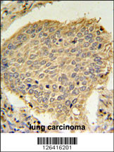 TPC6A Antibody (N-term) (Cat. AMM08294G) IHC analysis in formalin fixed and paraffin embedded human lung carcinoma followed by peroxidase conjugation of the secondary antibody and DAB staining. This data demonstrates the use of the TPC6A Antibody (N-term) for immunohistochemistry. Clinical relevance has not been evaluated.