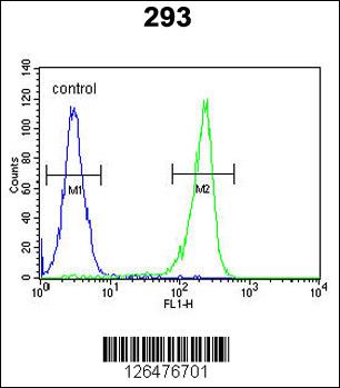 UNC50 Antibody (N-term) (Cat. AMM05463G) flow cytometric analysis of 293 cells (right histogram) compared to a negative control cell (left histogram).FITC-conjugated goat-anti-rabbit secondary antibodies were used for the analysis. |