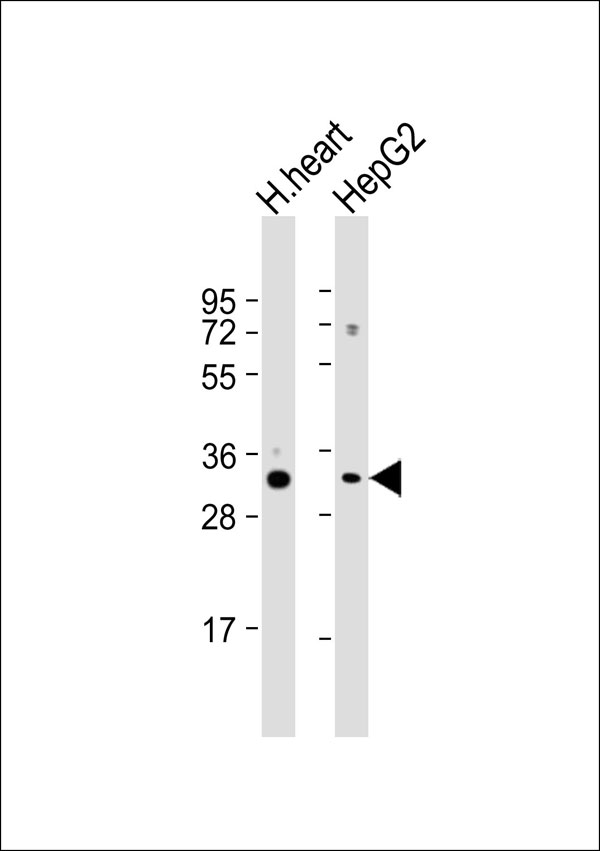 All lanes : Anti-ATP5C1 Antibody at 1:1000 dilution Lane 1: human heart lysate Lane 2: HepG2 whole cell lysate Lysates/proteins at 20 μg per lane. Secondary Goat Anti-Rabbit IgG, (H+L),Peroxidase conjugated at 1/10000 dilution. Predicted band size : 33 kDa Blocking/Dilution buffer: 5% NFDM/TBST. |