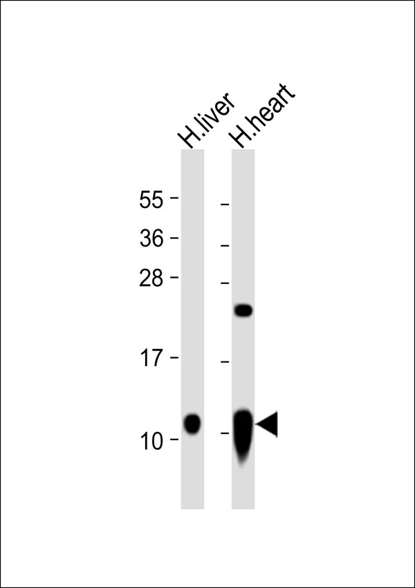 All lanes : Anti-ATP5I Antibody at 1:1000 dilution Lane 1: human liver lysate Lane 2: human heart lysate Lysates/proteins at 20 μg per lane. Secondary Goat Anti-Rabbit IgG, (H+L),Peroxidase conjugated at 1/10000 dilution. Predicted band size : 8 kDa Blocking/Dilution buffer: 5% NFDM/TBST. |